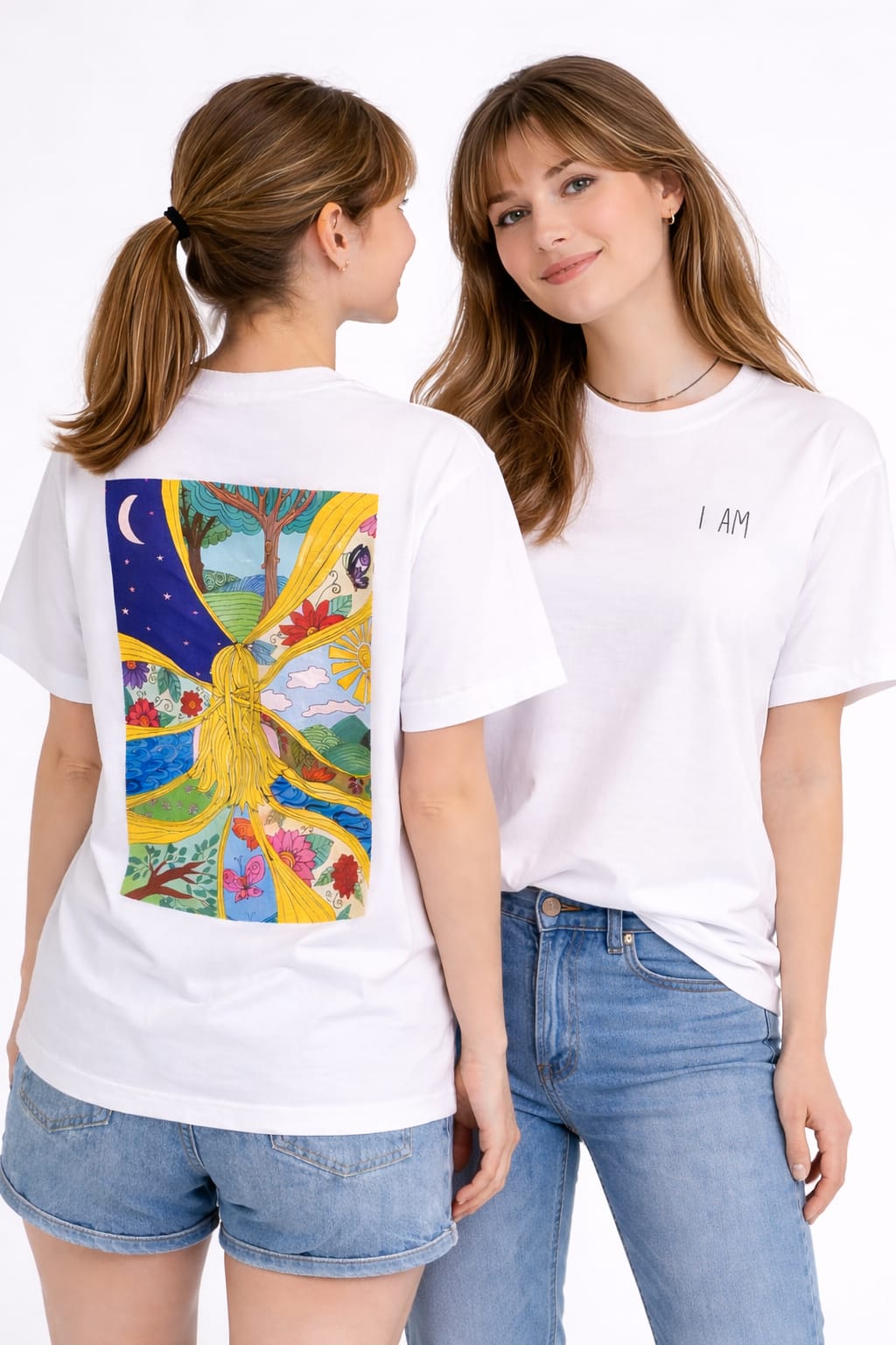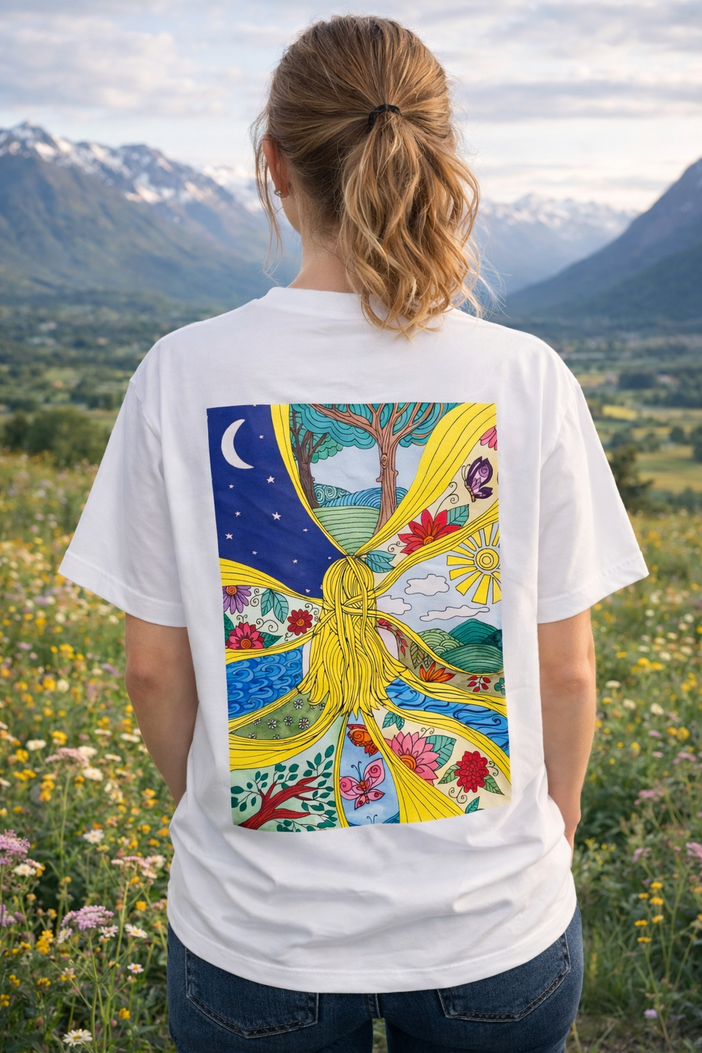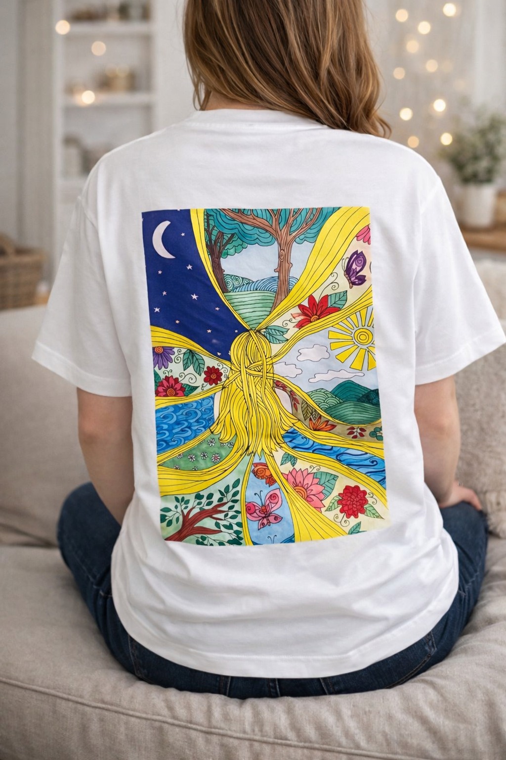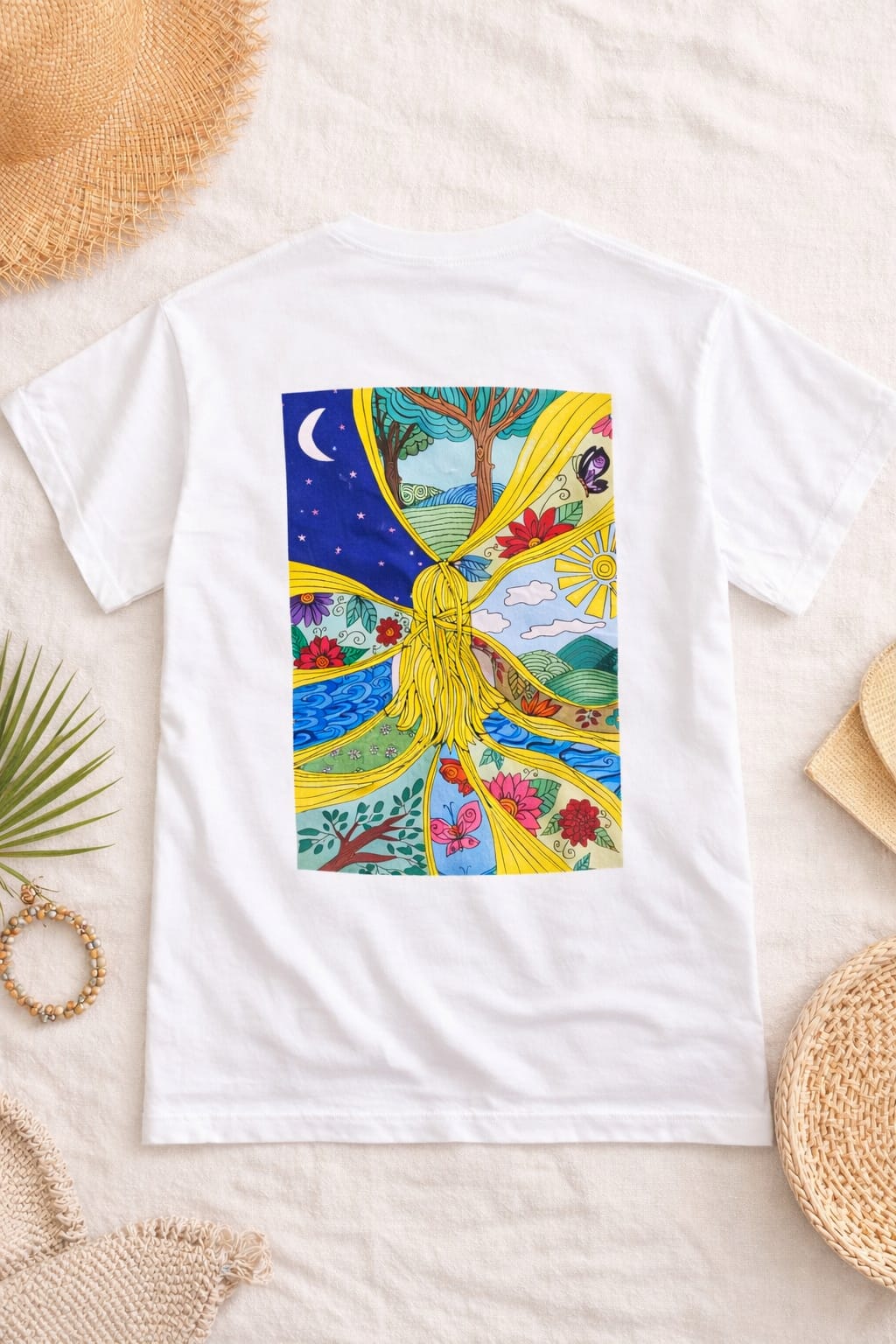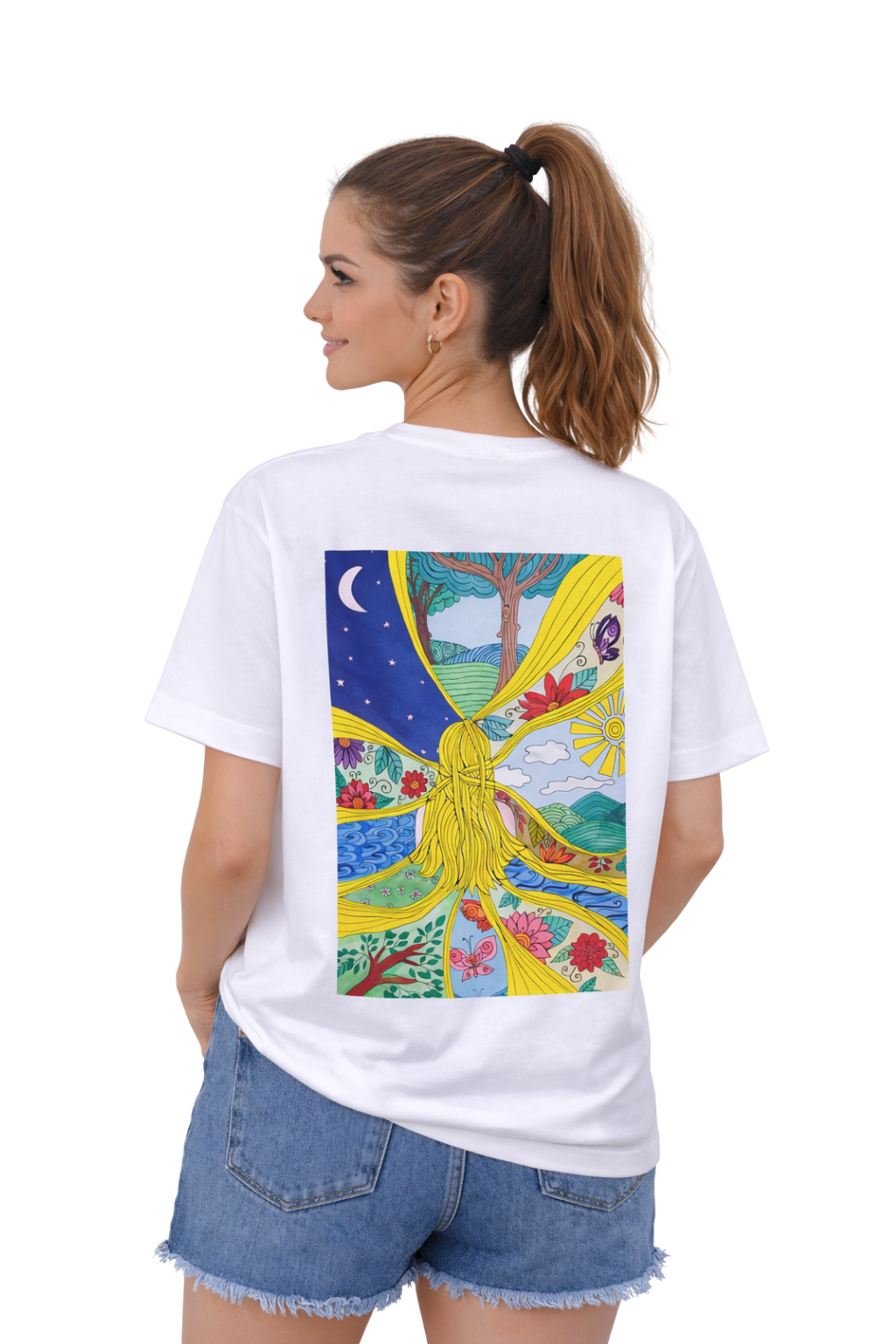 This women’s graphic T-shirt features a colorful Straw Girl illustration inspired by self-awareness, inner harmony, and the beauty of being fully present. The artwork appears as a large expressive print on the back, transforming the shirt into a vibrant piece of wearable art.