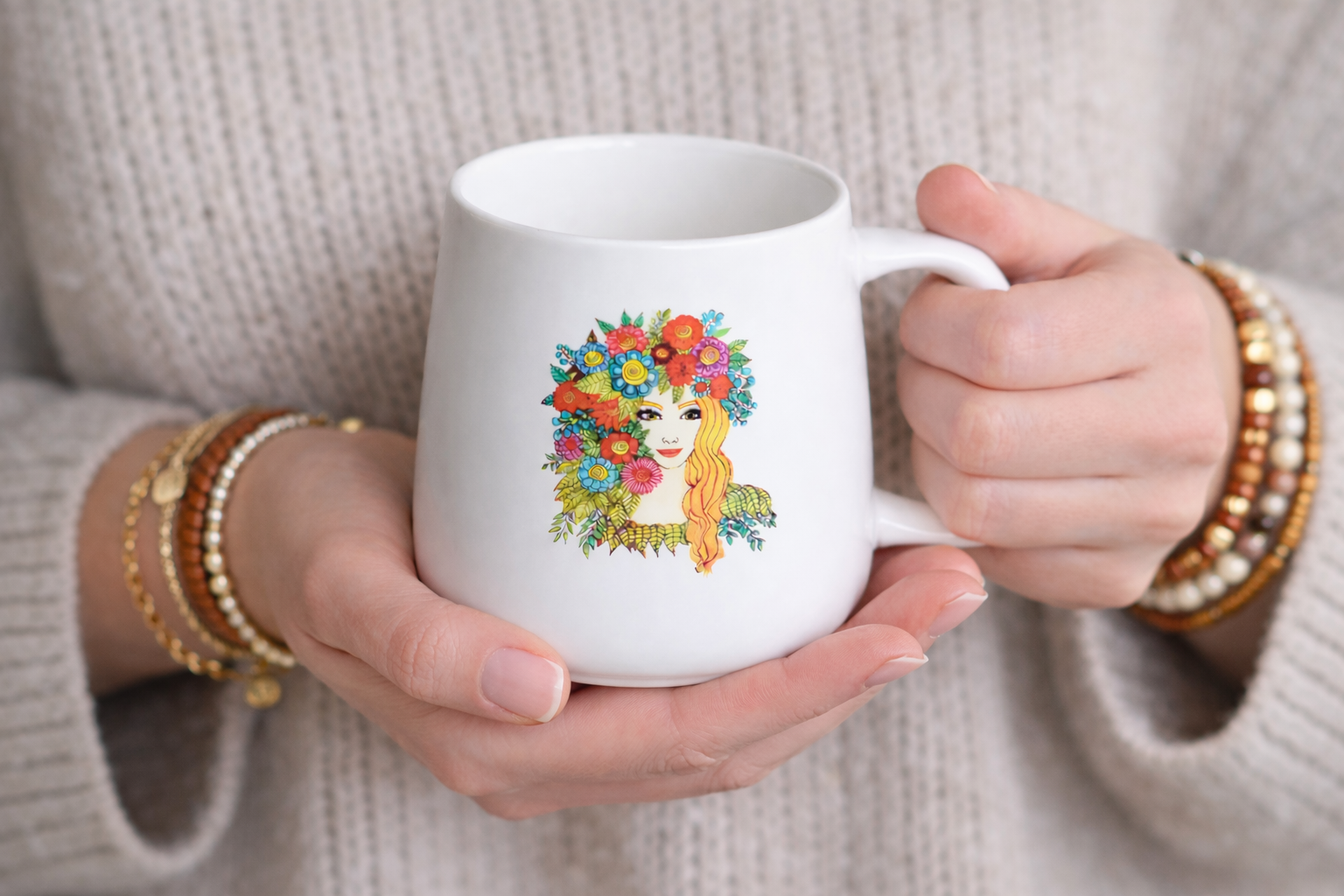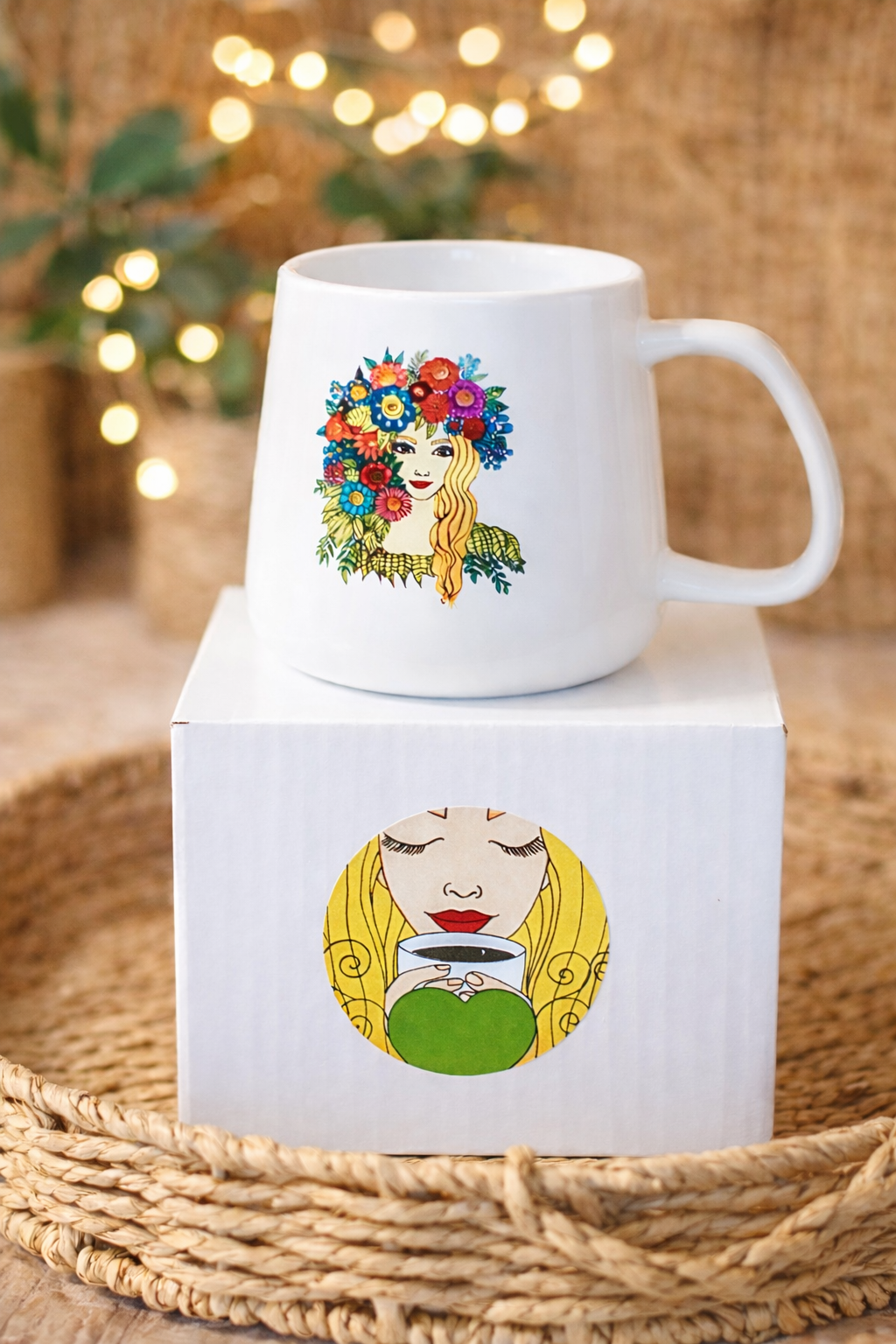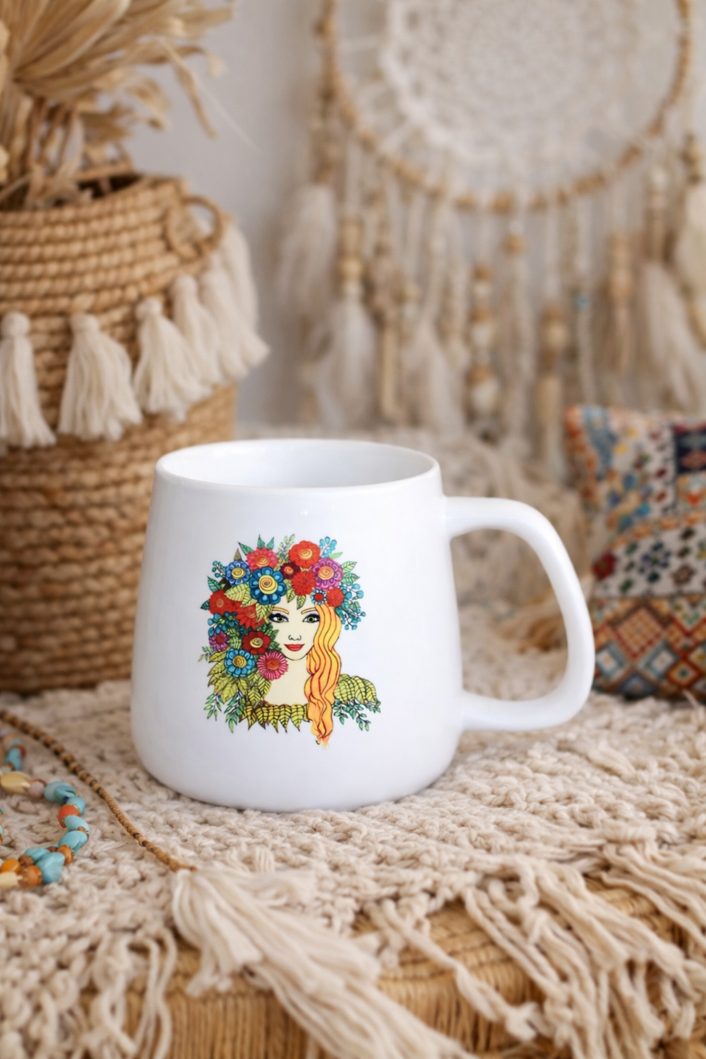 This large 450 ml ceramic coffee mug is created for slow mornings, reflective evenings, and mindful daily rituals. At the same time, the colorful Straw Girl illustration crowned with flowers brings warmth and artistic beauty to your everyday routine. Because of this, even a simple cup of coffee or tea can become a small moment of calm and inspiration.