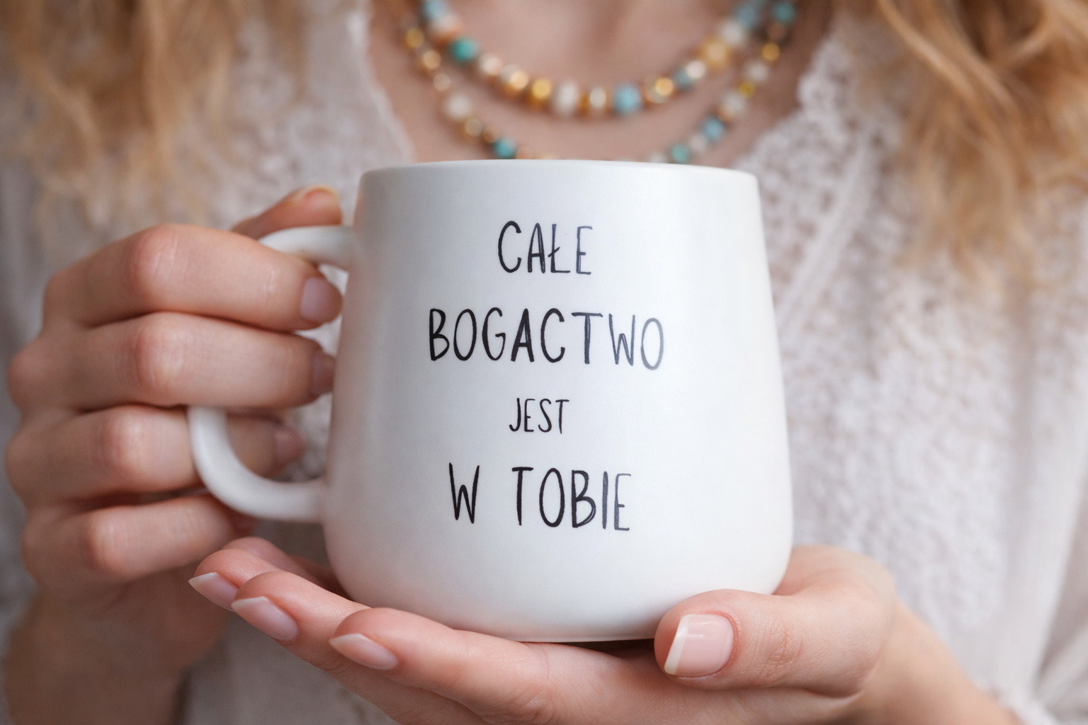 More than a ceramic mug — it is a gentle reminder of your inner strength. In fact, the affirmation CAŁE BOGACTWO JEST W TOBIE speaks about a deeper kind of wealth. Instead of focusing on material things, it celebrates sensitivity, resilience, awareness, and quiet confidence.