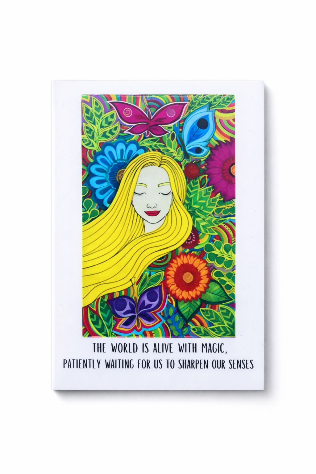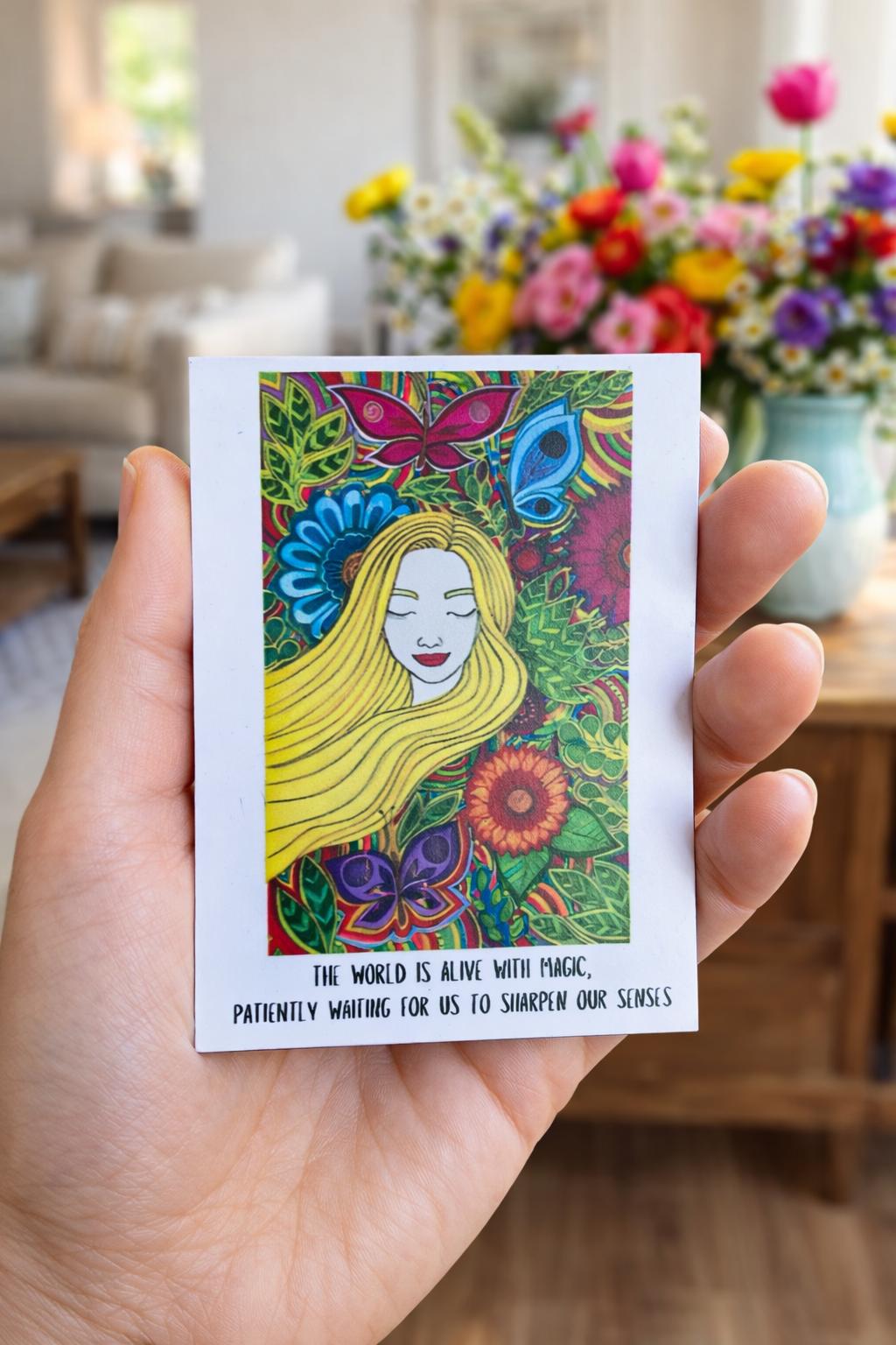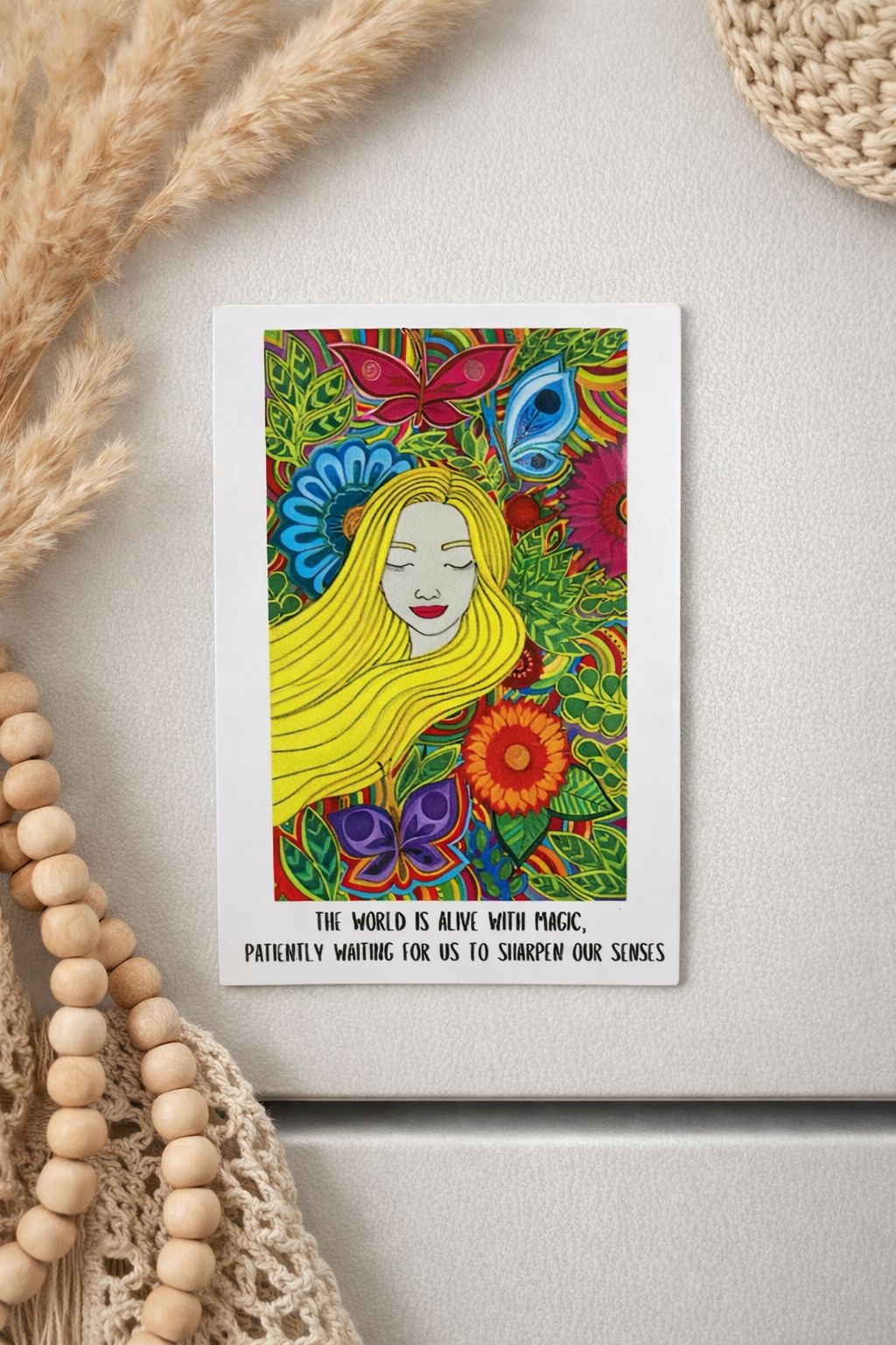 Reconnect with the magic of the present moment with this vibrant Straw Girl Magnet. Inspired by mindfulness, awareness, and sensory presence, this design invites you to slow down and truly experience the world around you.